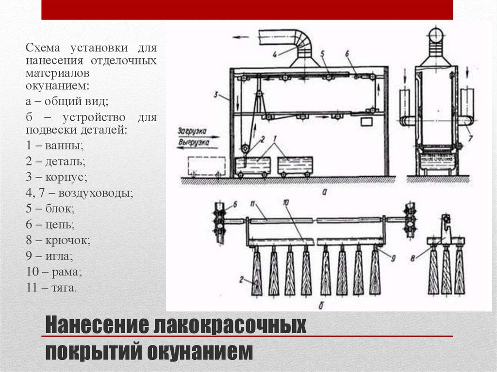Ванны с краской обычно возвышаются над уровнем пола приблизительно на 0,8 м или при расположении ниже этого уровня ограждаются барьером высотой не менее 0,8 м. в зависимости от объема производства и габаритов изделий их погружение в ванну осуществляют вручную, с помощью пневмо- и электроподъемников или на подвесных конвейерах с непрерывным или периодическим движением транспортной цепи.