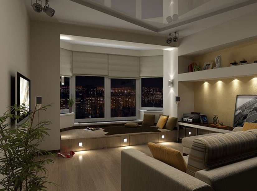 Используя комбинированный вариант, любое помещение можно зонально разделить на функциональные зоны, причем при этом помещение будет увеличено визуально: