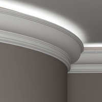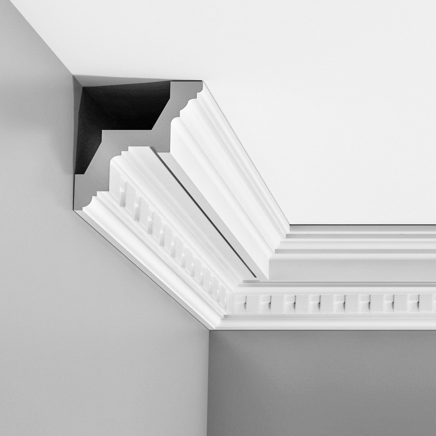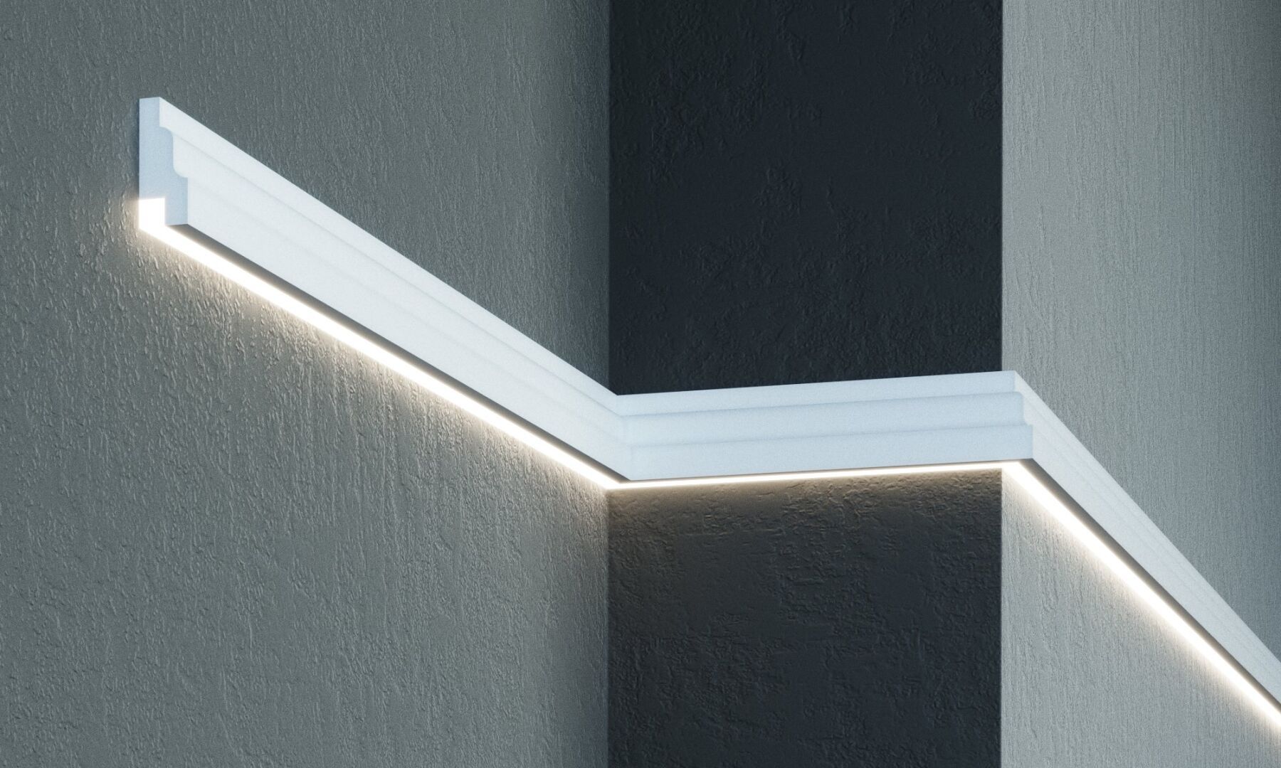 Этот материал — полистирол, однако большие плинтуса, особенно при организации скрытого освещения, делают из полиуретанов — более прочных и устойчивых.