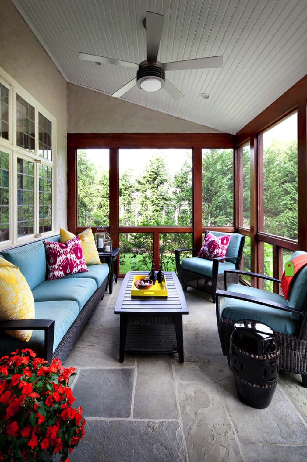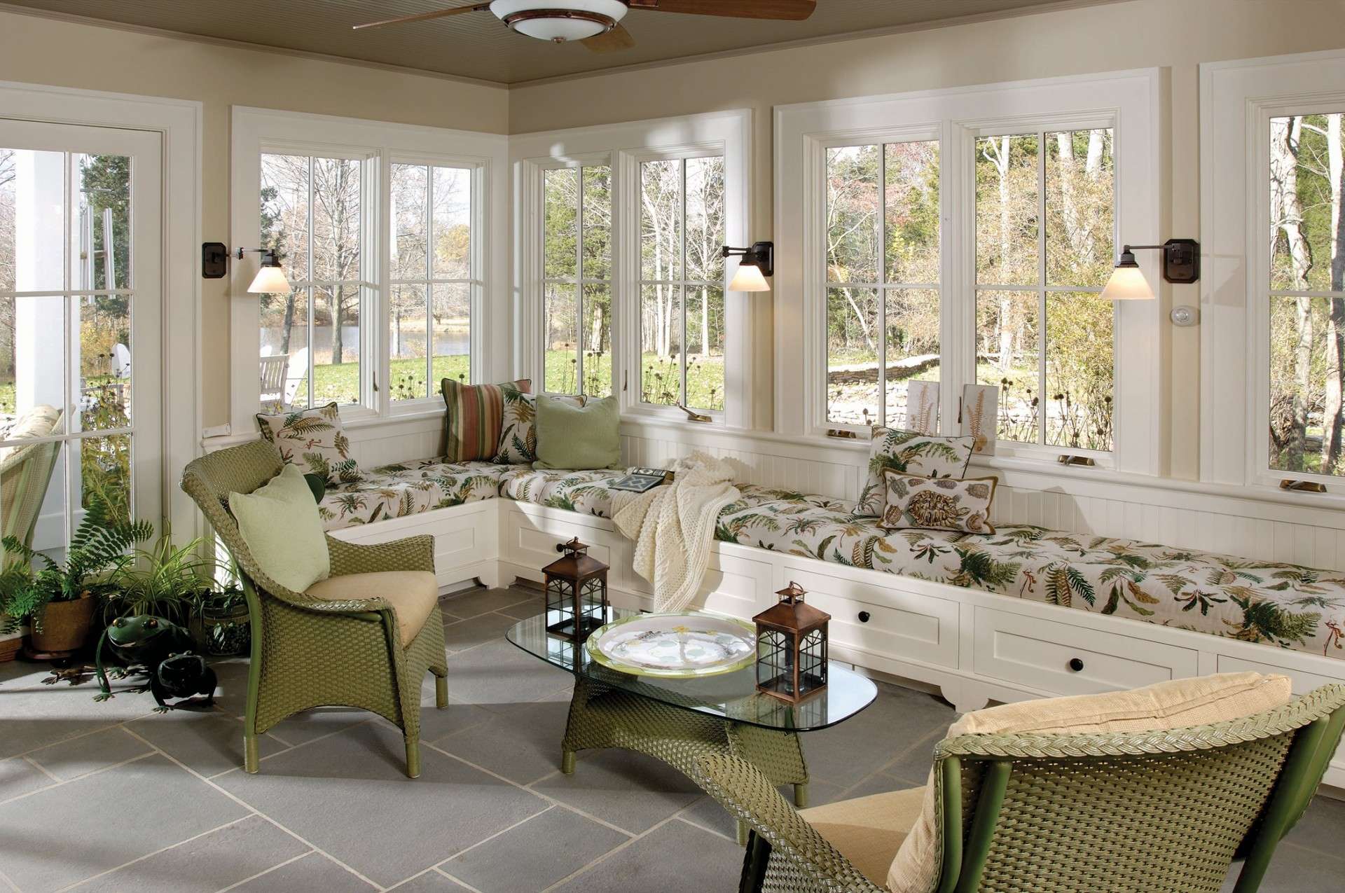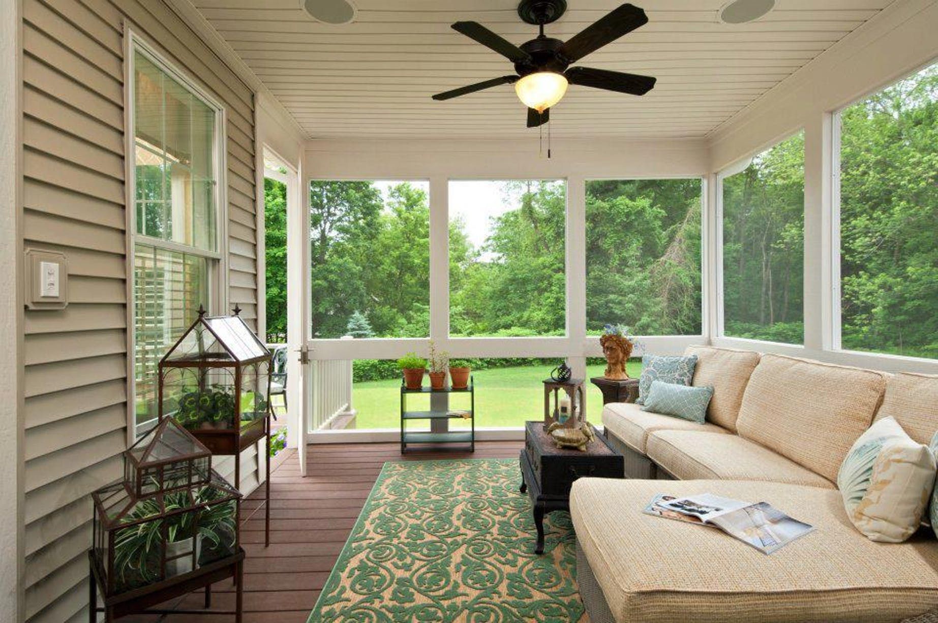 Не менее популярна и идея превращения веранды в красивую гостиную с помощью правильно подобранной мебели. Для создания нужной атмосферы лучше всего подойдет диван, габариты которого будут соответствовать площади помещения, пара кресел в тон, телевизор, журнальный стол.