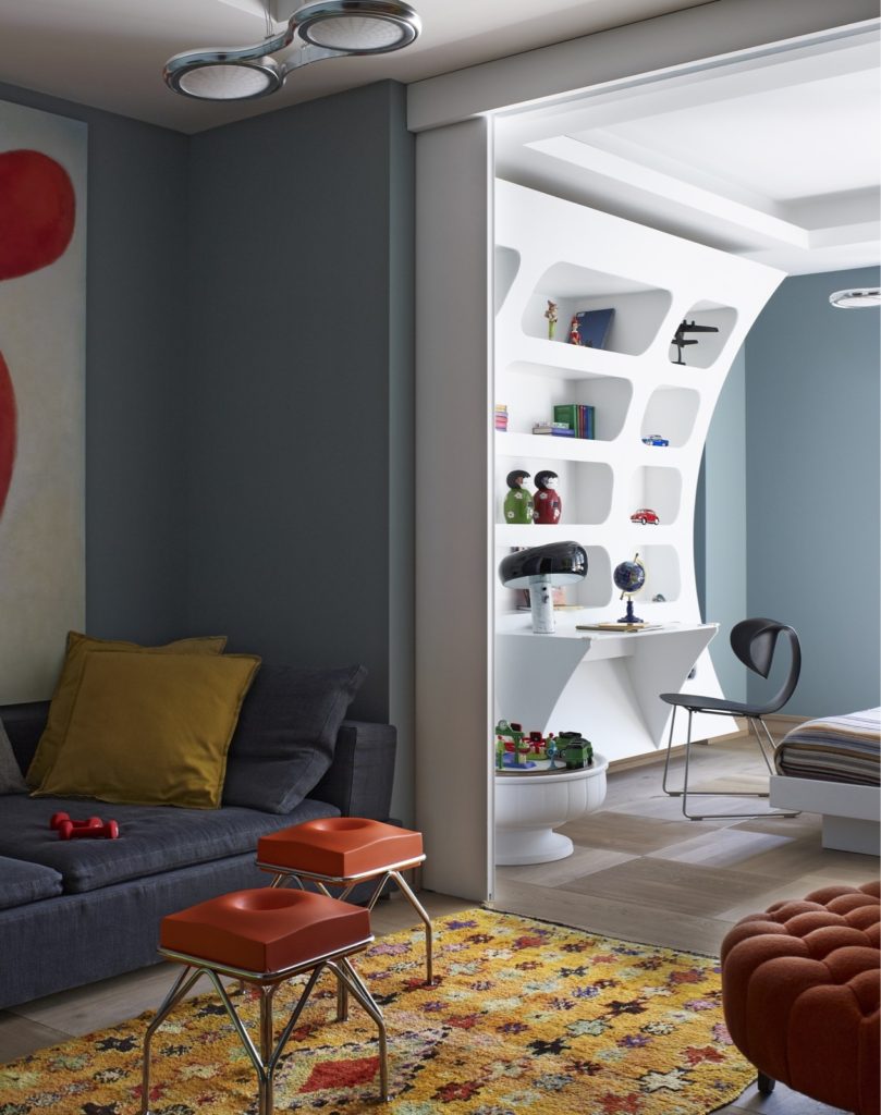 Разделение комнаты лучше всего выглядит «спонтанным», а именно, когда пространство разделено с помощью предметов мебели. Это могут быть развлекательные блоки, стеллажи, пара диванов, расположенных спиной к спине, с отдельными журнальными столиками или даже простые коврики.