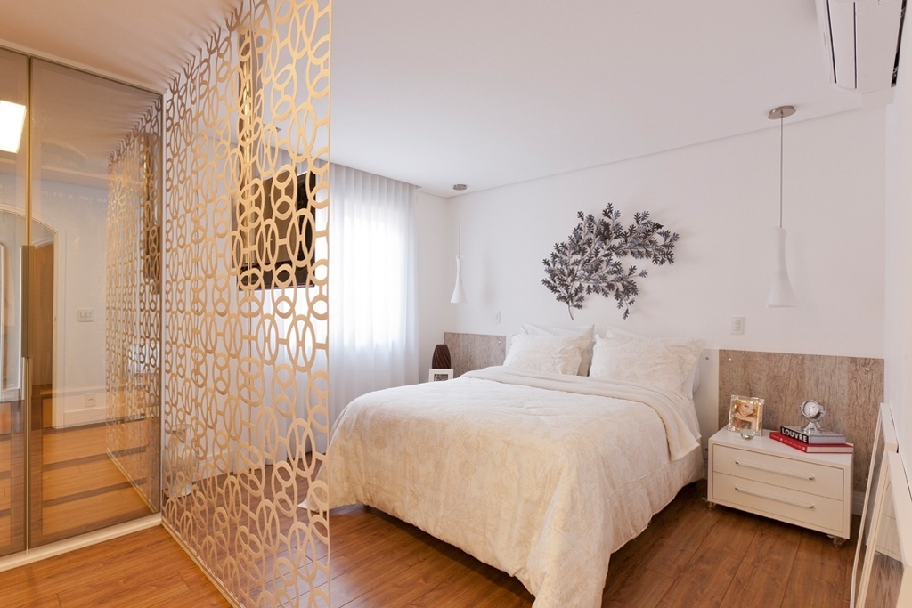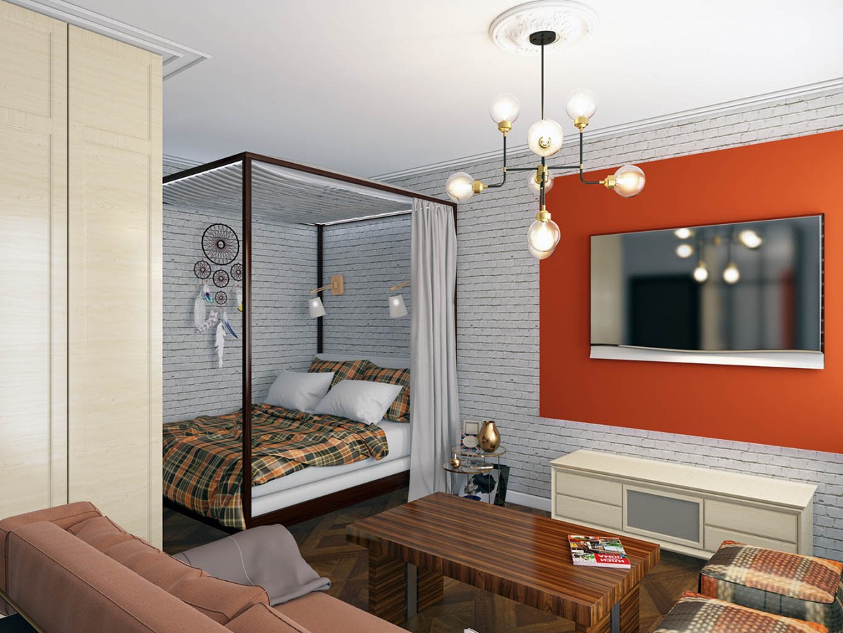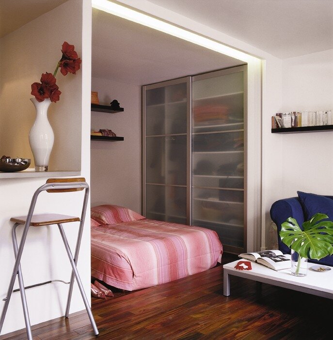 Отличный вариант для зонирования помещения — ниши. Здесь можно оборудовать спальное место или полноценную гардеробную, сэкономив деньги на приобретение шкафов-купе.