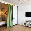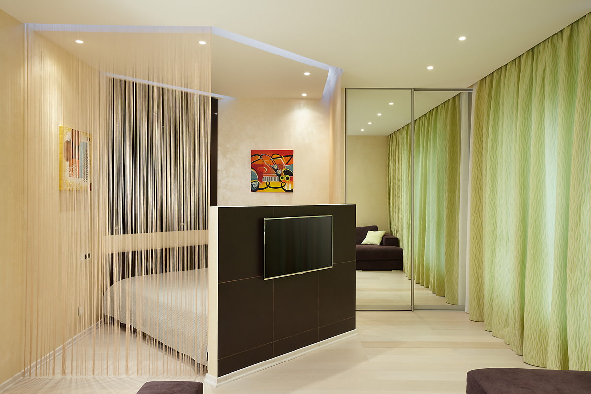 Зонирование комнаты при помощи штор придает помещению дополнительный уют. Кроме того, это бюджетное решение, не требующее дорогостоящих ремонтных работ. Как правило, шторы применяют для отделения спальной зоны или индивидуального рабочего места. Отделить зону кухни с помощью штор нельзя, поскольку текстиль быстро загрязняется и впитывает запахи.