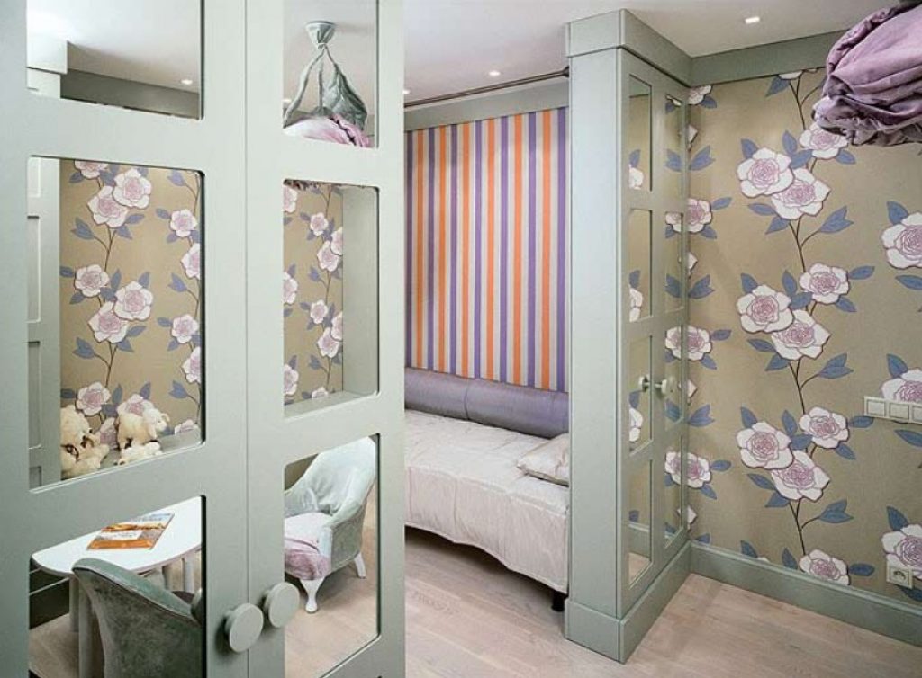 Однако, применение классического платяного шкафа как перегородки имеет и отрицательные стороны. Например, это необходимость декорирования задней стенки, которая, как правило, смотрится не очень привлекательно (шкаф рассчитан на установку возле стены). Удобно использовать зеркало в качестве декоративного элемента, что позволяет визуально расширить соответствующую зону. Кроме того, тяжеловесная конструкция загромождает комнату.