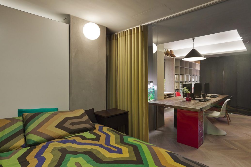 Чтобы этого не произошло, стену выполняют не из гипсокартона, а из матового или цветного стекла. Помещения остаются изолированными, и проблема использования естественного света тоже решена. Если «комната», оставшаяся затемненной, предназначена для гардеробной или рабочего места, можно использовать только искусственное освещение. Размещение осветительных приборов в каждом случае индивидуально.