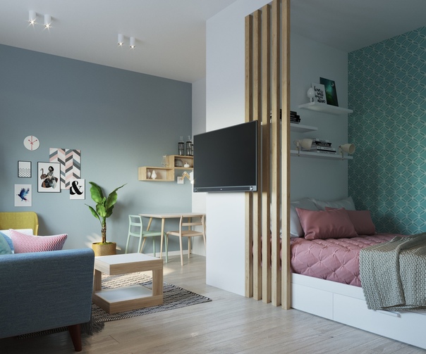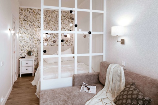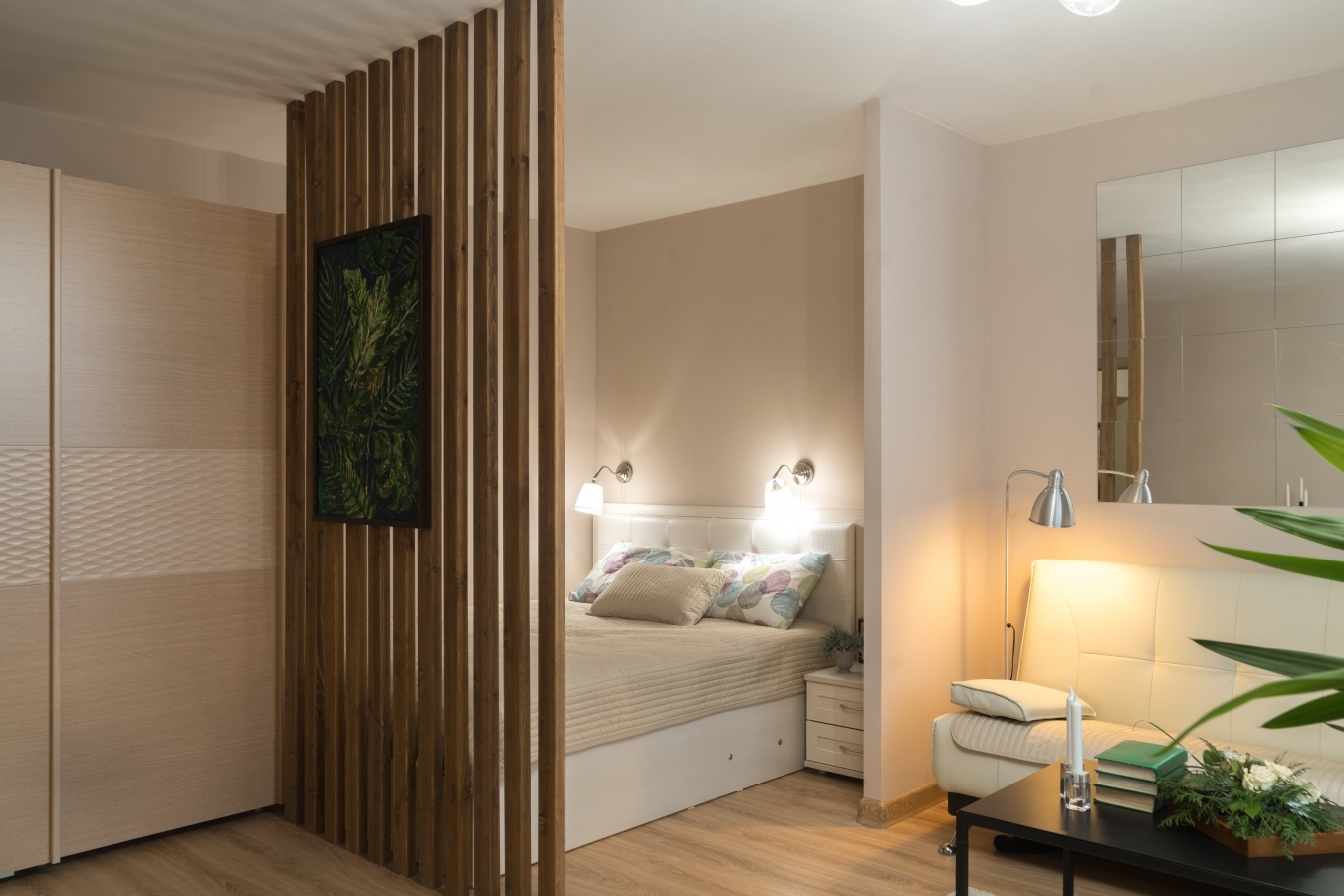 - Эффективное разделение комнаты на два помещения без необходимости установки сплошной перегородки.