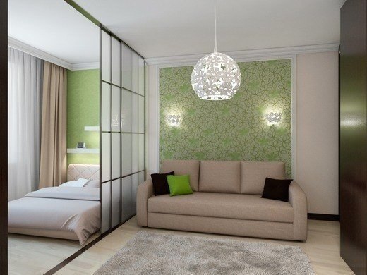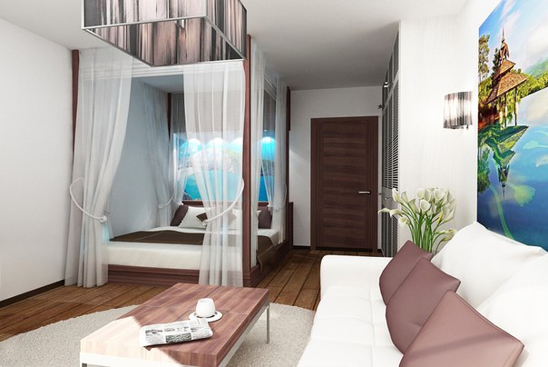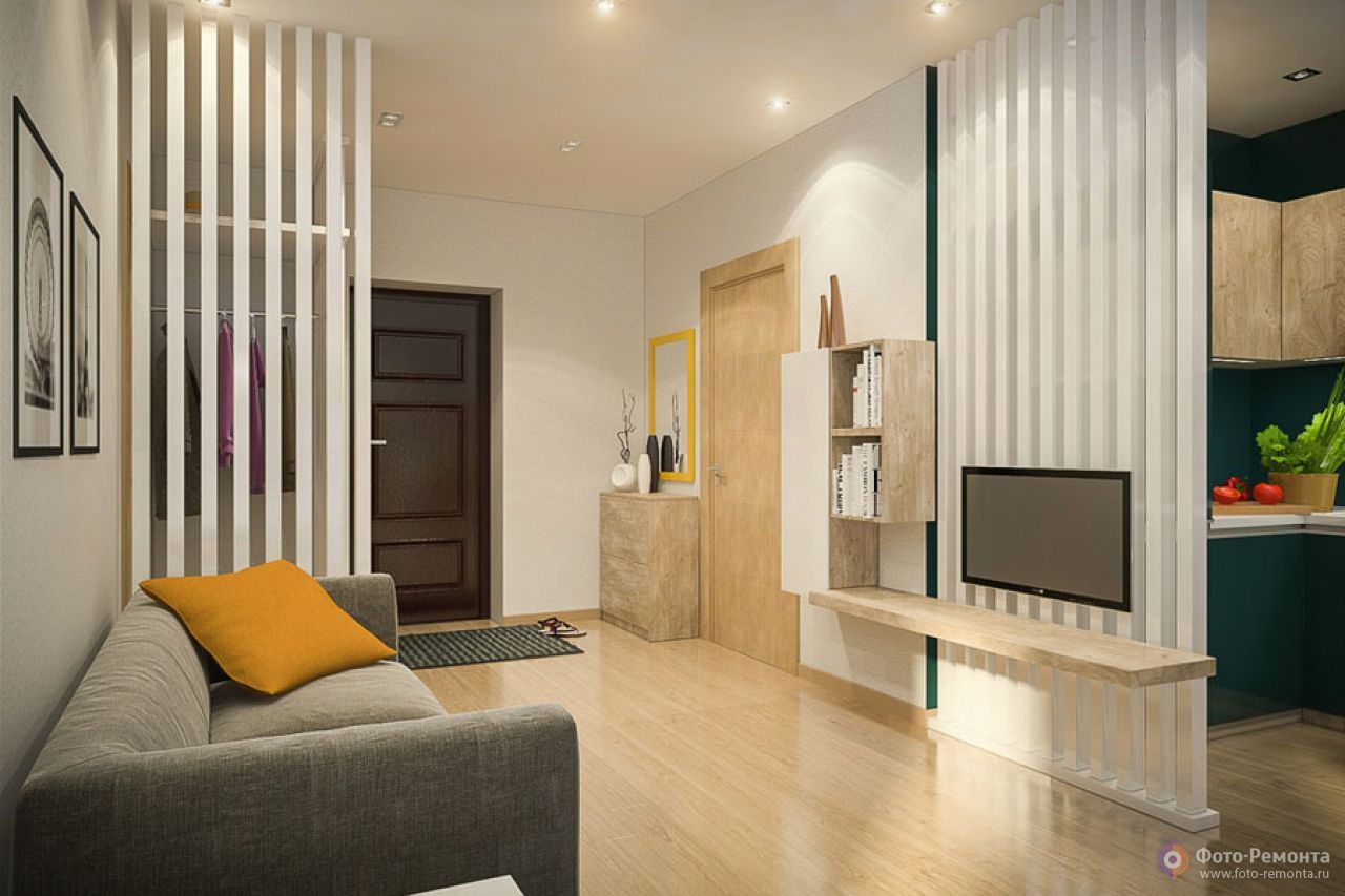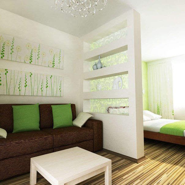 - Разделение проходной комнаты с эффектом отдельного помещения.