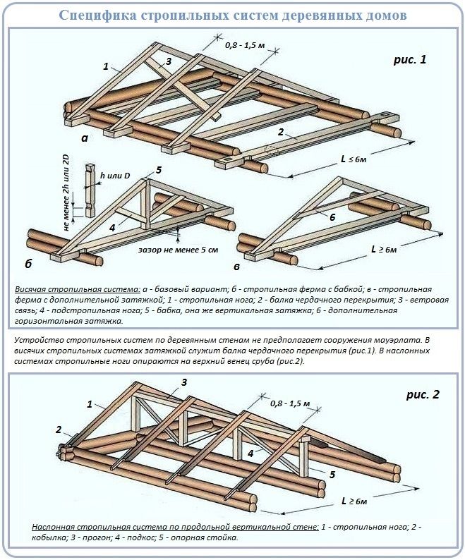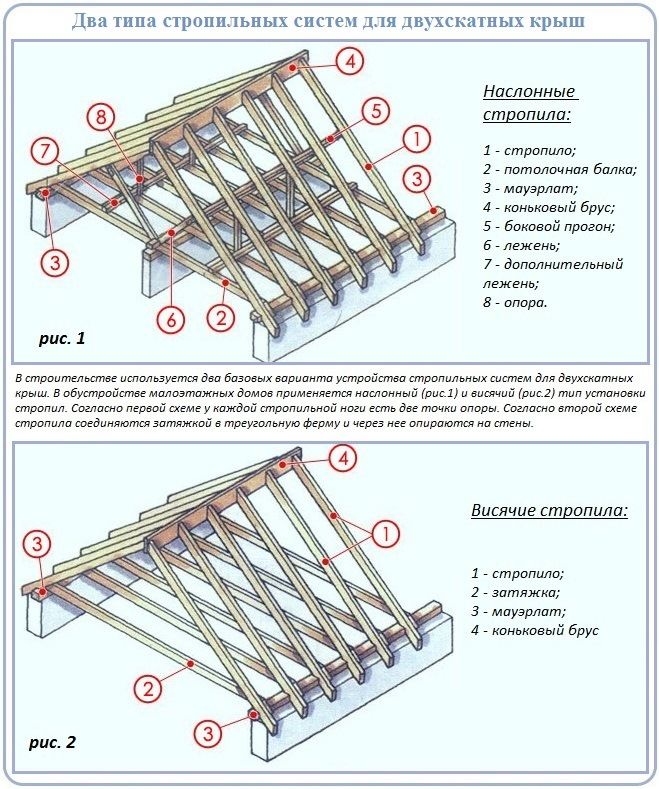 Существует два вида систем двухскатных крыш: с наслонными и висячими стропилами. Применяемый тип стропил связан с размером здания.