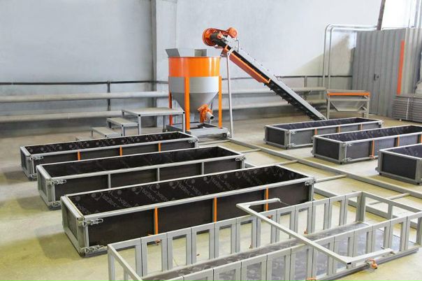 легко добавить рельсы для передвижения форм, камеры прогрева и элементы автоматизации, чтобы получить конвейерный завод.