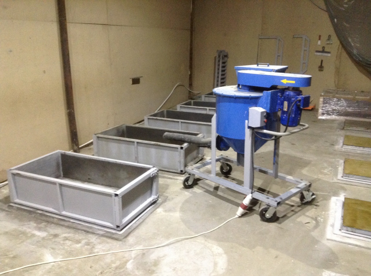 Стационарные линии: формы не двигаются, и заливка происходит с перемещением смесителя по рельсам.