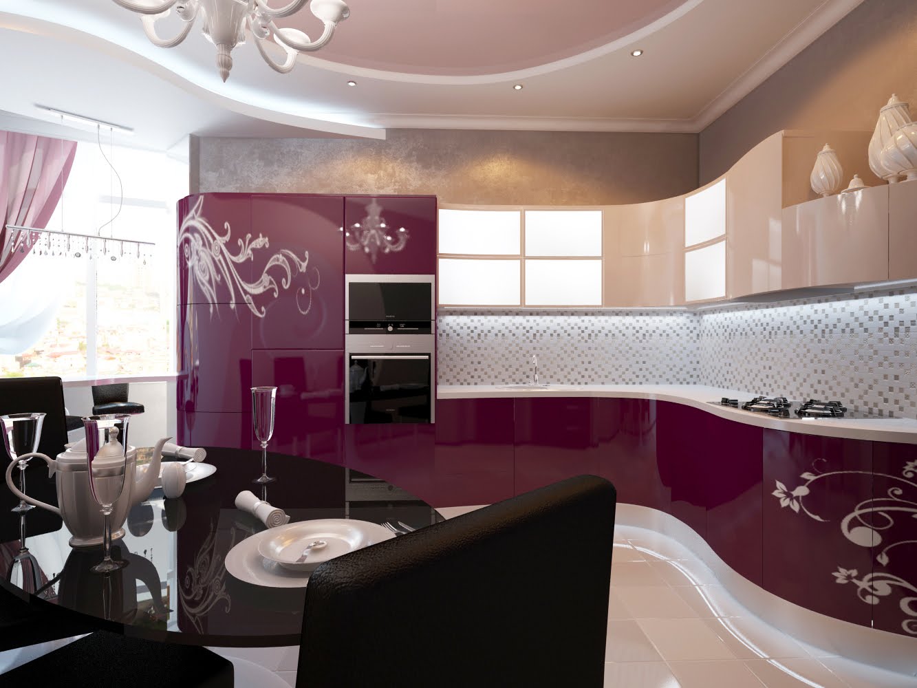 Если кухня недостаточно просторная, мелкий узор и темный фон на плитке сделают ее еще меньше и мрачней; - мебельный гарнитур для лилового интерьера должен быть максимально лаконичной формы, геометрически правильных пропорций и без лишних декоративных деталей на фасаде.