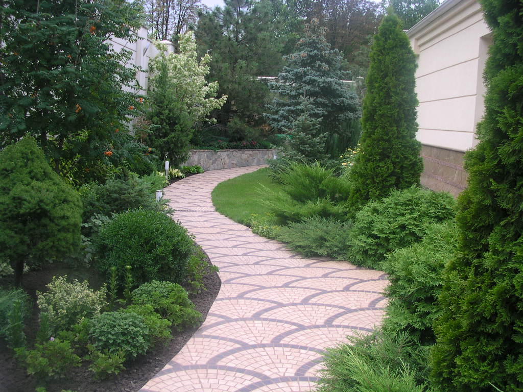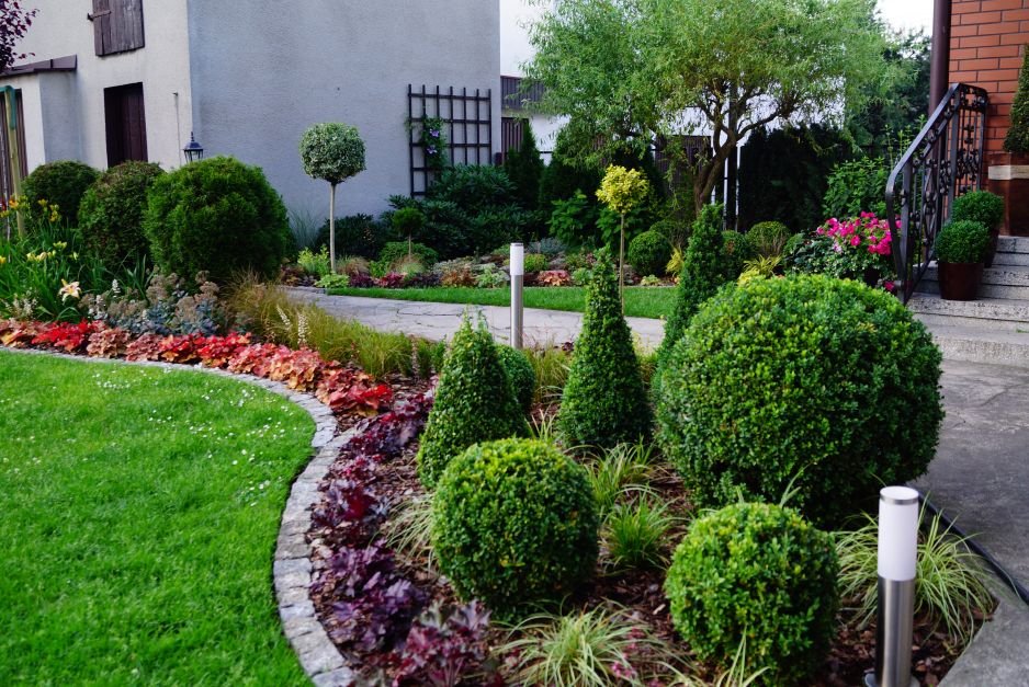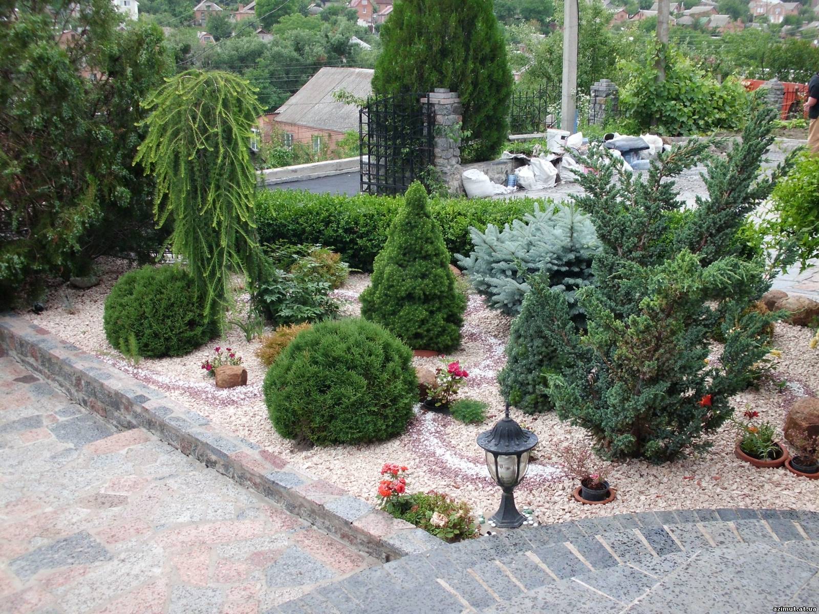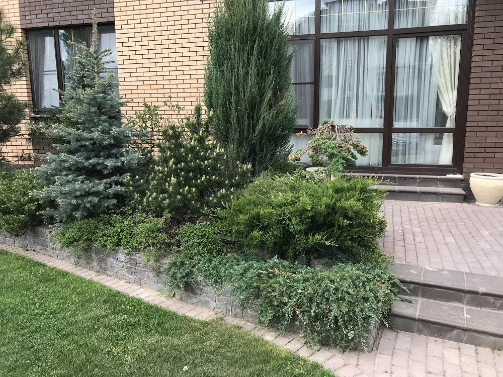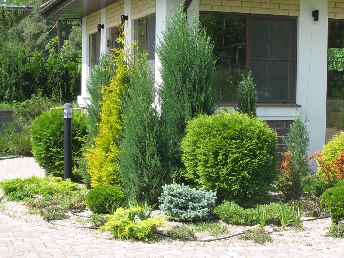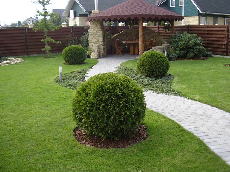 уличный брабант и можжевельники в горшках, шаровая разновидность дерева в саду, интересные примеры оформления участка