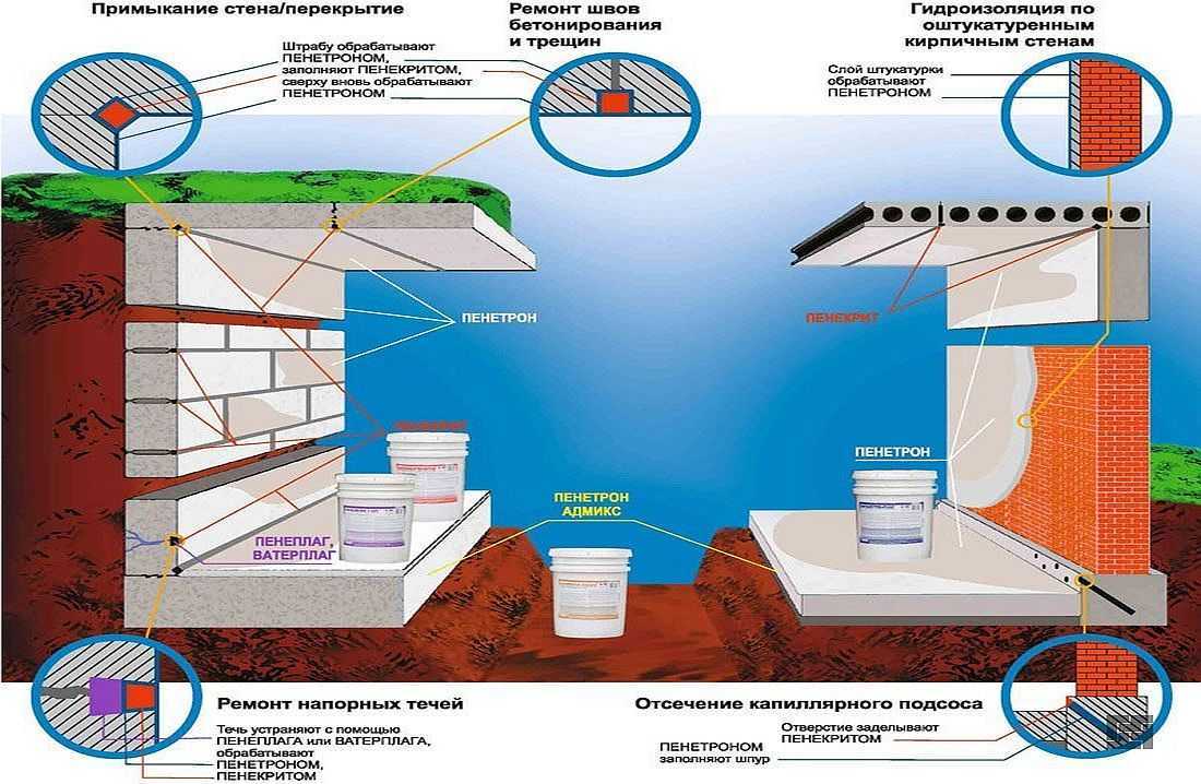 Суть проникающей гидроизоляции заключается в проникновении изолирующего материала в глубину поверхности сквозь капилляры и микротрещины. Современные материалы, такие как Пенетрон, способны проникать вглубь на глубину до 600 мм.