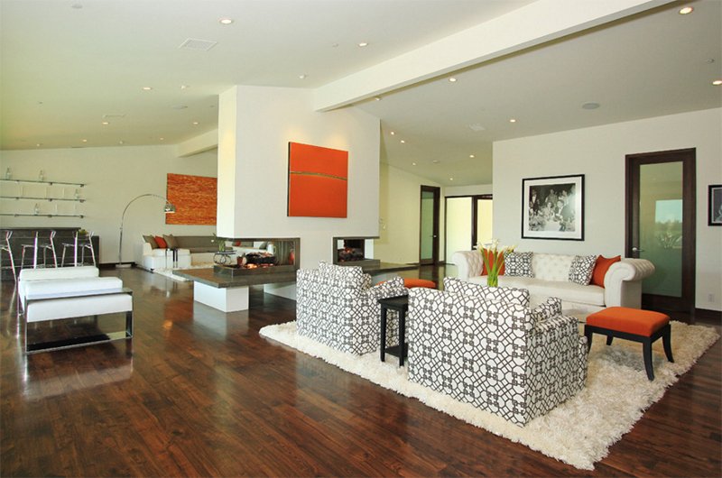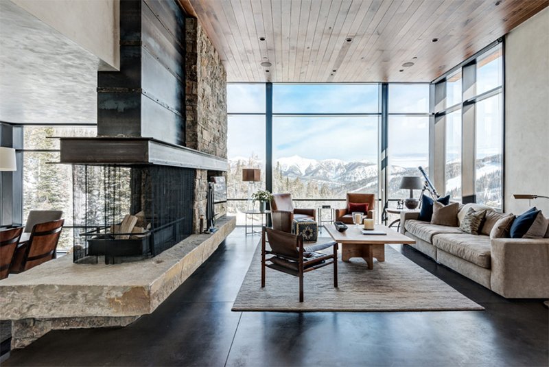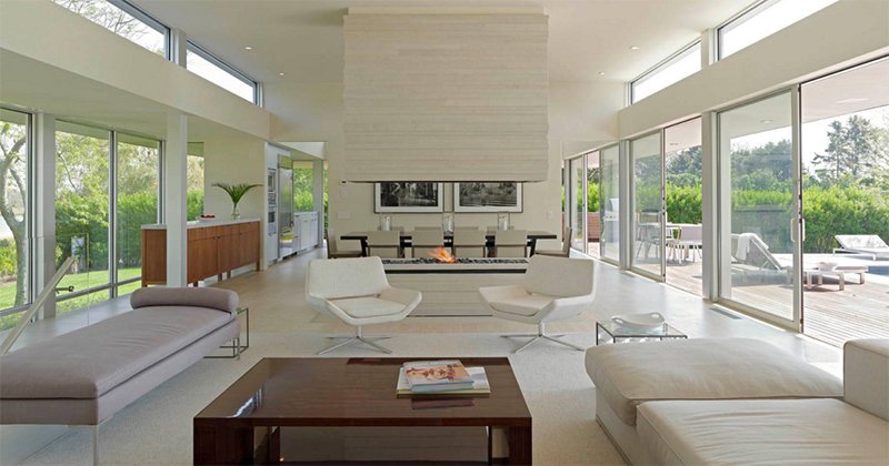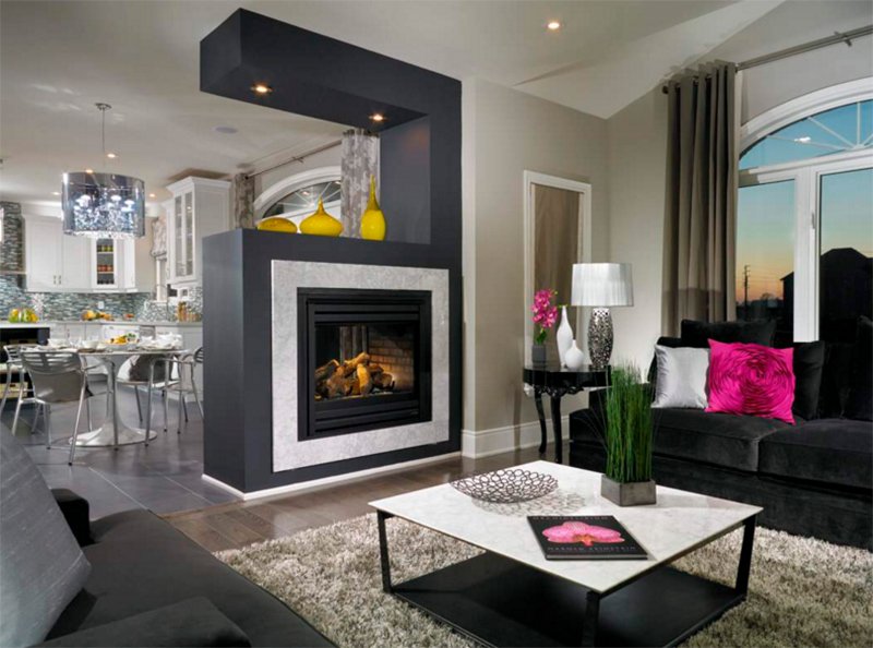 Двусторонний камин с большой стеклянной перегородкой идеально подходит для этой просторной гостиной