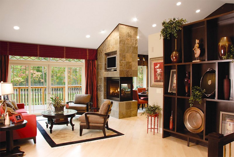 Последний вариант особенно эффектен, когда речь идет о камине с печью в гостиной. Такое сооружение отличается большими размерами и служит превосходным разделителем между гостиной, столовой