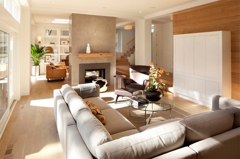 Интерьер гостиной со встроенным камином современного дизайна