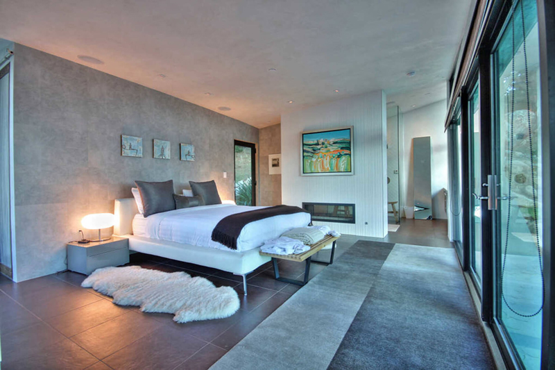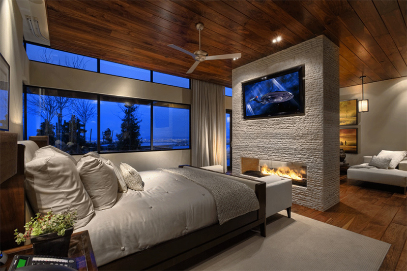 Еще одна потрясающая современная спальня с серым камином. С другой стороны от современного камина находится зона отдыха, обращенная к окну, откуда открывается хороший вид на природу.