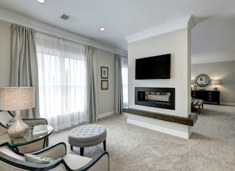 Хорошая идея — добавить камин не только для того, чтобы обогреть два помещения, но и для уединения.И эта спальня выглядит очень потрясающе с серыми и белыми цветами вокруг нее.