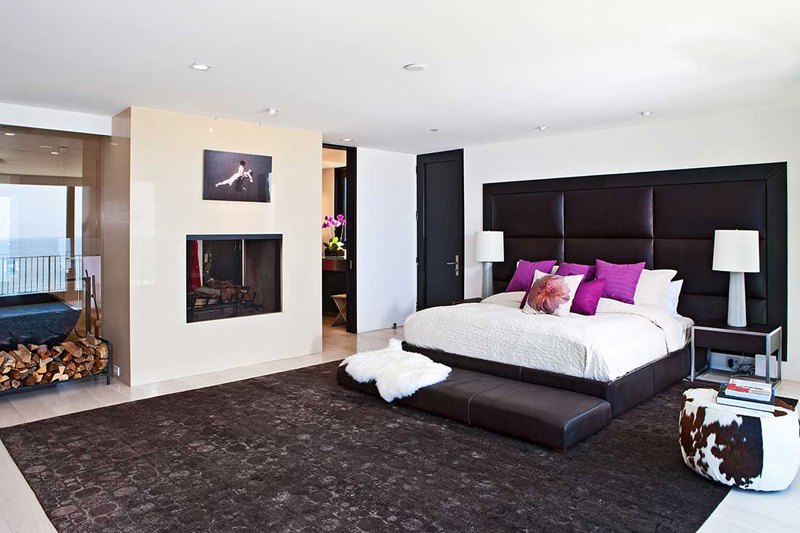 Разве это не красивая спальня? Мне нравятся фиолетовые акценты на кровати с огромным кожаным изголовьем.Вы также можете увидеть, что здесь есть пуфик из воловьей кожи и аккуратный современный камин.