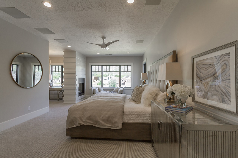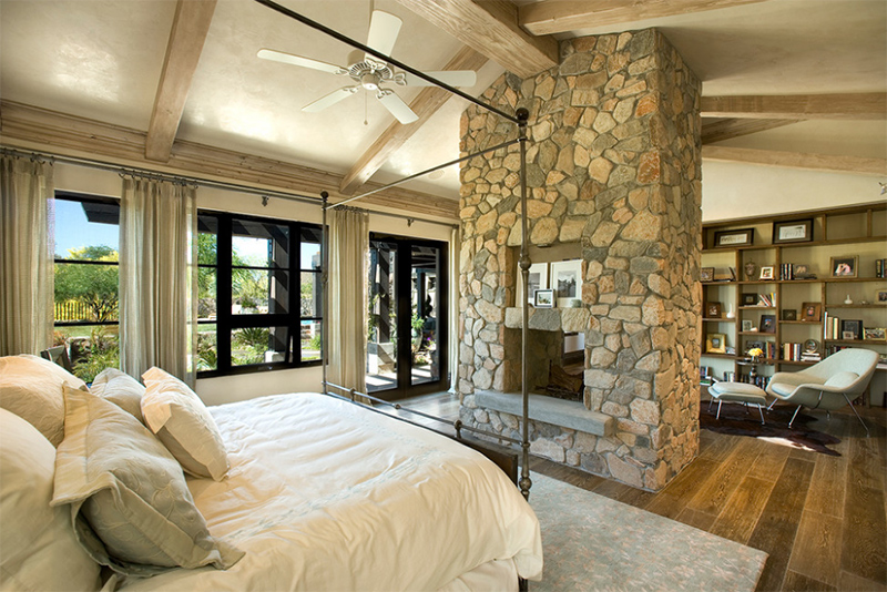 В спальне в стиле ранчо есть каменный камин, который ведет к кровати и читальной зоне.