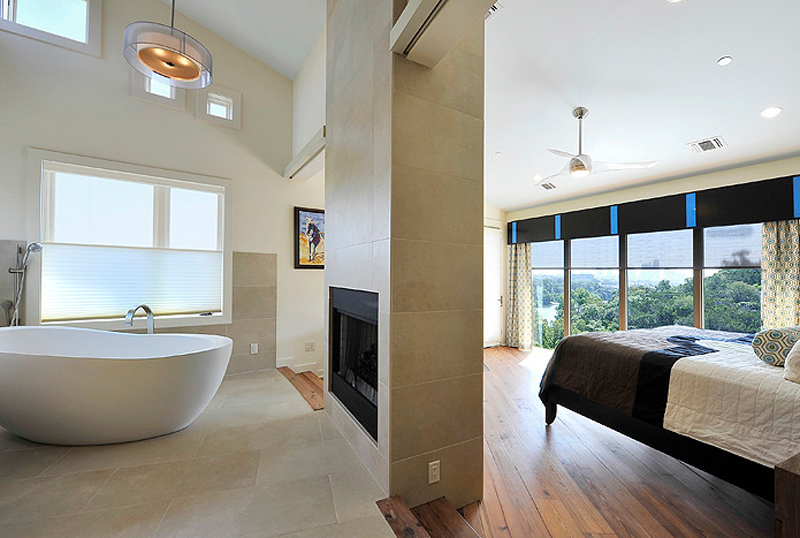 В этой спальне есть приподнятая ванна, которая дополняется высоким камином. Это действительно красиво выглядит с такой раскладкой, не так ли?