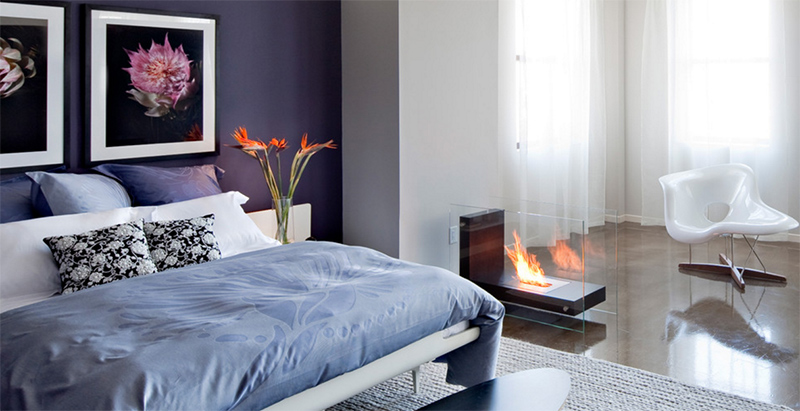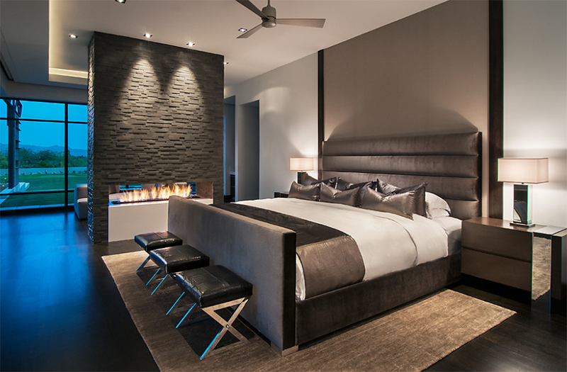 Великолепная современная спальня со стеклянным камином, которая также имеет красивый дизайн, который добавляет привлекательности пространству.
