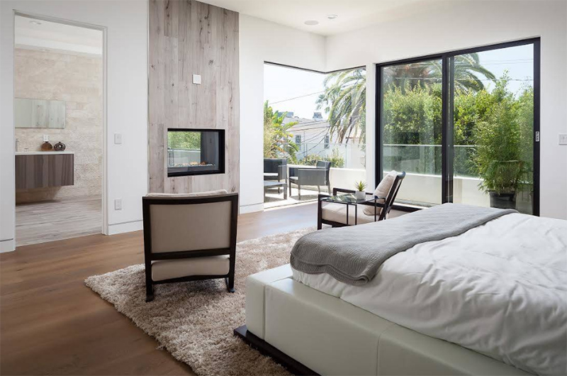 Спальня с видом на пляж и современный камин Современный газовый камин для шикарного и стильного дома
