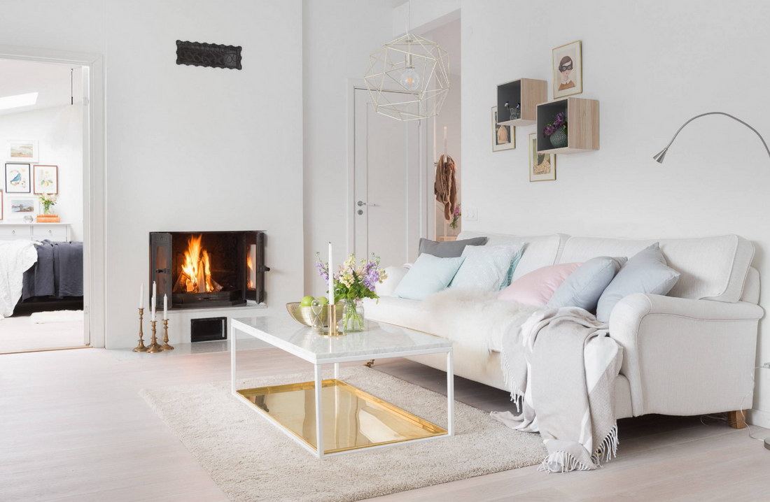 Ярким цветовым и декоративным акцентом в дизайне гостиной в светлых тонах может стать каминная зона, оформленная по всем канонам жанра. Стеновая панель, очерчивающая область камина, декорирована легким узором, гармонирующим с рисунком природного камня, и украшена круглым зеркалом в стиле современное ар-деко. На каминной полке расположились постеры в рамах и цветочная ваза, а портал из белого мрамора с прожилками и очаг с имитацией кирпичной кладки — место притяжения всех взглядов и символ уюта в интерьере.