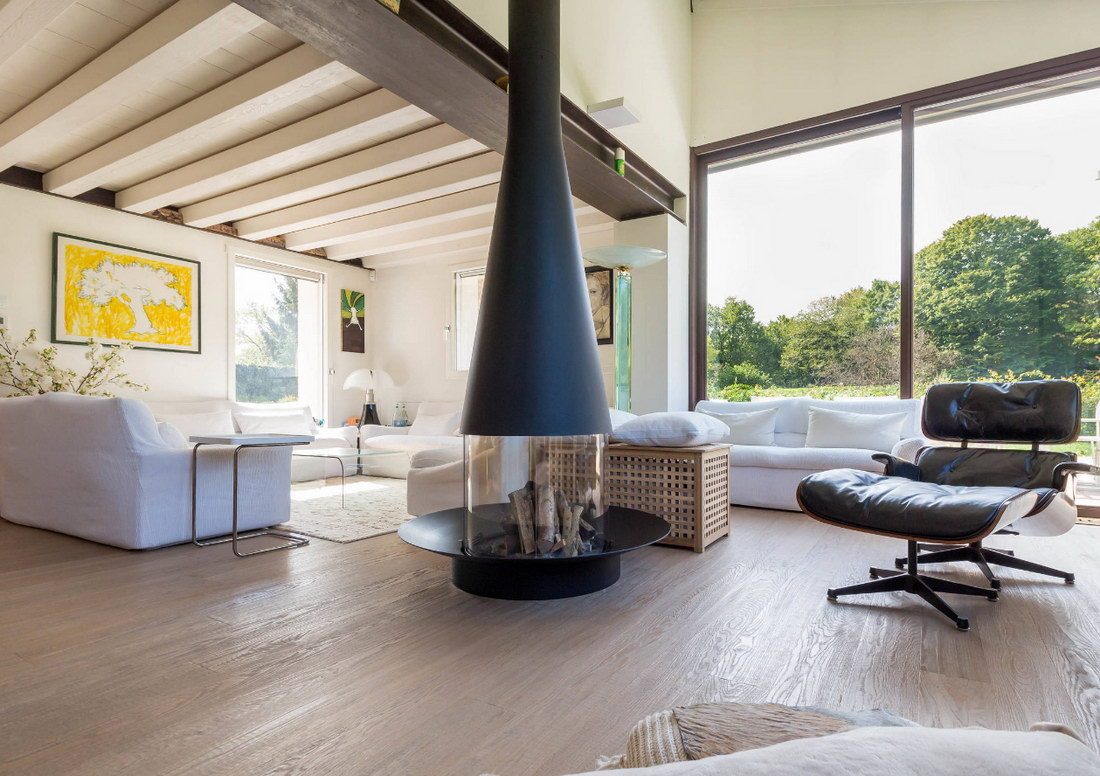 Камины с панорамной топкой, позволяющие любоваться игрой пламени с трех сторон, сегодня являются одними из самых популярных. Такие модели, как правило, используются в дизайне мультифункциональных гостиных, где служат для зонирования пространства. Они могут устанавливаться в перегородку или выступать в роли самостоятельного элемента интерьера – все зависит от концепции дизайн-проекта и планировки помещения.