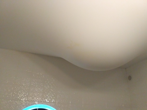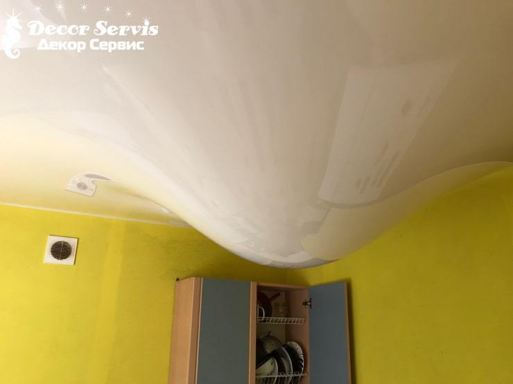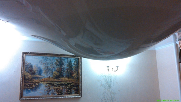 Вода, попавшая внутрь комнаты, скапливается на потолке. Как правило, полотно ввиду своей эластичности провисает под тяжестью воды. Потолочная поверхность приобретает вид свисающей капли. Если правильно спустить воду и просушить полотно, можно рассчитывать на то, что вам удастся восстановить потолок в прежнем виде. Однако не каждый материал способен восстановиться после массированного контакта с водой.
