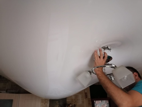 Сделайте так: когда расход воды уменьшится, поднимите провисшую часть потолочного полотна и слейте воду в емкость. Слаженная работа команды из двух-трех человек очень быстро приведет к желаемому результату.