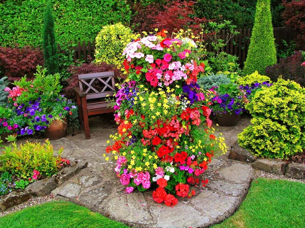 Яркую вертикальную клумбу из цветов лучше установить неподалеку от места для отдыха, так вы сможете постоянно любоваться своим детищем