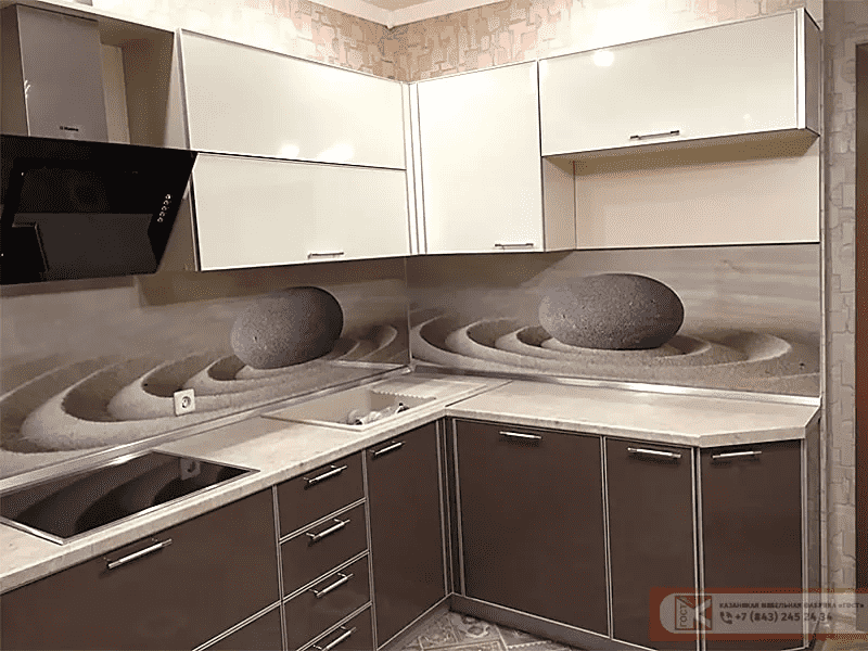 Кухня в цвете кофе с молоком отлично смотрится с металлической фурнитурой. При этом на некоторых шкафчиках присутствует хромированная окантовка. Она служит выделением центра в обстановке. Рабочая зона оформляется в виде горизонтальной мозаики. Столешница выполняется на тон светлее, может иметь мраморную имитацию.