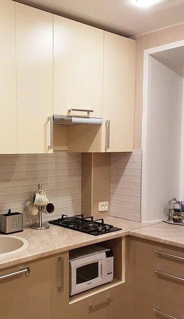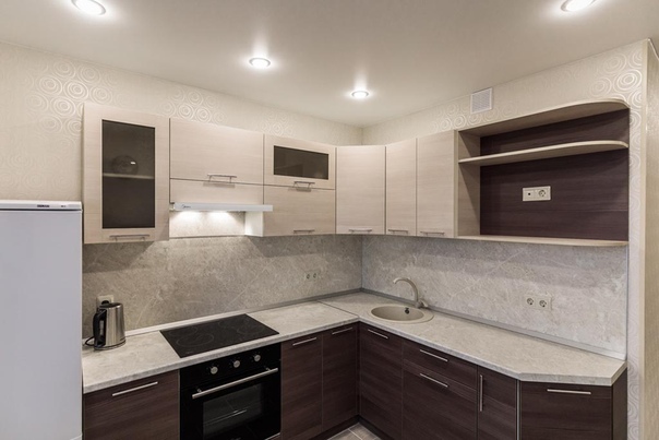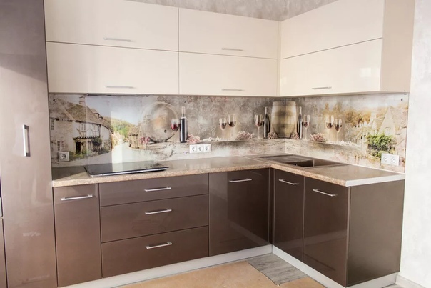 Угловая кухня с различными вариантами оформления гарнитура. Преобладает теплый молочно-кофейный оттенок. Небольшое количество верхних шкафчиков можно оформить в белоснежном тоне. Что касается фартука, то пиксельная плитка — это идеальный вариант. В таком дизайне хорошо смотрится металлическая фурнитура на фасаде.