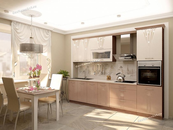 - Потолочную зону стараются оформлять в любом светлом тоне. Это может быть белый, капучино, бежевый или крем-брюле. Потолок стараются выделять на тон светлее фасада мебели.