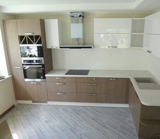 Натурально и естественно смотрится оформление, когда нижняя часть гарнитура имеет белый оттенок, а верхняя – коричневый с имитацией под дерево. Таким образом удается зонировать угловую кухню и сделать акцент в обычной линейной вариации расстановки мебели. Подобный дизайн будет оригинален с облицовкой стен светло-зеленым или фисташковым оттенком. При этом оформление пола стараются выполнять с имитацией под серый мрамор или гранит.