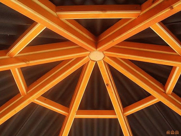 Стропильная система состоит из шести брусков (чаще всего используется брус 150 на 50 мм), которые крепятся в центре друг с другом с помощью деревянного шпиля и металлического фартука, а также в каждом угле отдельно к верхней обвязке.