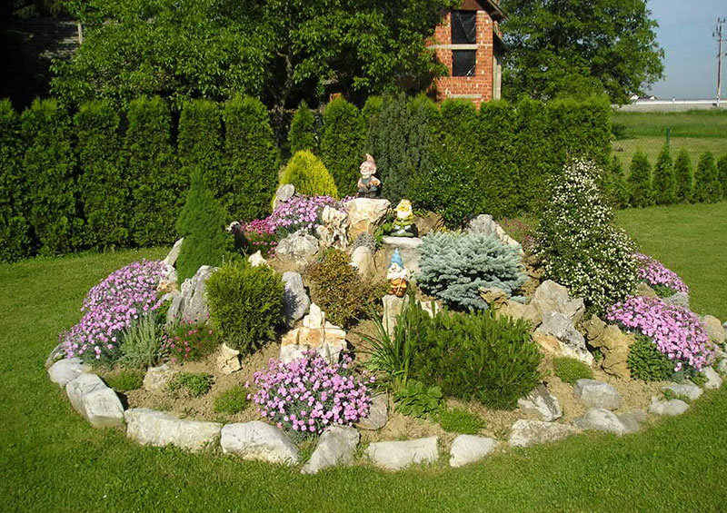 Даже если у вас не большой загородный участок, альпийская горка на даче будет смотреться отлично. Это будет аккуратный декоративный уголок, который легко удивит соседей.