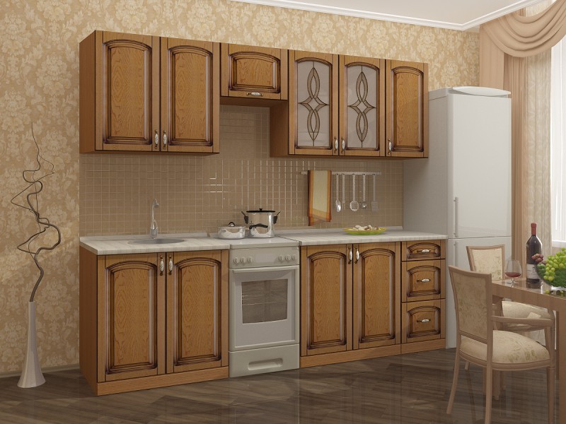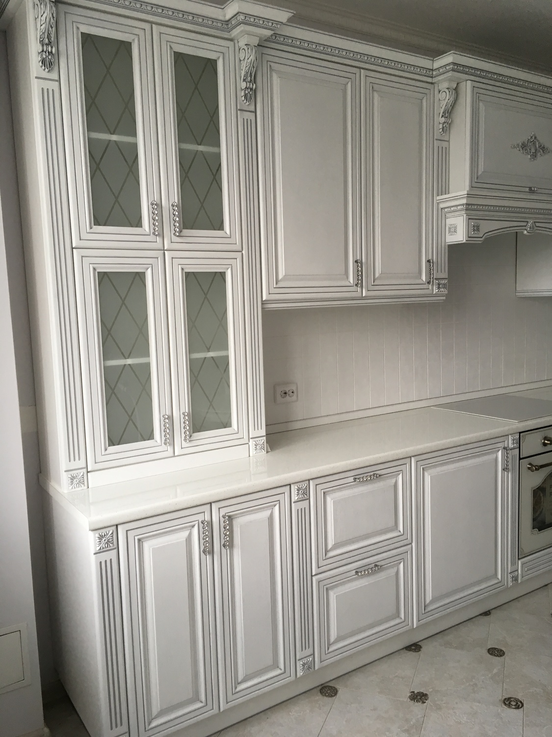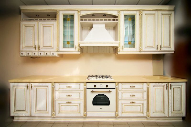 Если денег не хватает, следует учитывать, что цена на фасады даже с самым элементарным гарнитуром будет намного выше, чем на обычный. классический дизайн. В гарнитур входят: стеклянные вставки, решетки, радиусные двери и т.