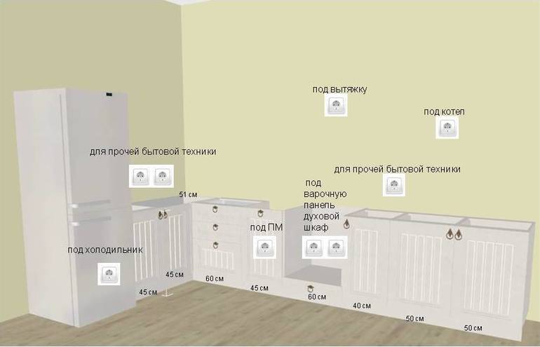 Планируя прокладку ЛЭП на кухне, безусловно, следует исходить из реальных характеристик бытовой техники. Наверное, лучше будет обратиться в электромонтажную организацию — специалисты должны помочь составить проект с учетом всех нюансов и требований безопасности.На основе этой схемы можно будет составить чертеж с размещением розеток «на земле» — определить места для размещения розетки в стене и вырезания для них стробоскопов.