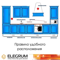 Третий уровень 200-250 см от пола, здесь установлены розетки для подключения вытяжки и освещения. Эта высота также выбирается с учетом возможности доступа к розеткам. Достаточно просто встать на стул и розетка перед глазами. И стоя на полу, их не видно за верхними кухонными шкафами.
