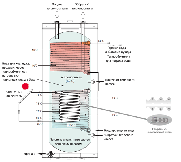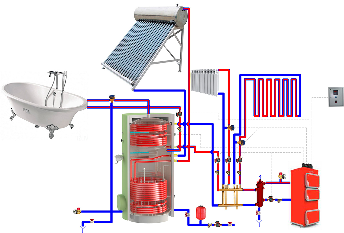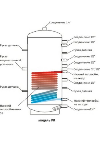Отопление, которое требует высокой температуры, отбирают воду вверху бака, а отопление с низкой температурой, соответственно внизу емкости.