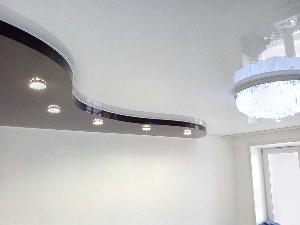На многоуровневых конструкциях практикуется установка освещения в гипсокартонной части конструкции. Это намного надёжнее. Кроме того, часто используются светодиодные ленты, спрятанные в нишах и выступах гипсокартонного бордюра. Но они направляют свет горизонтально и, несмотря на отражающий эффект глянцевой поверхности, не могут выполнять функции полноценного вечернего освещения.