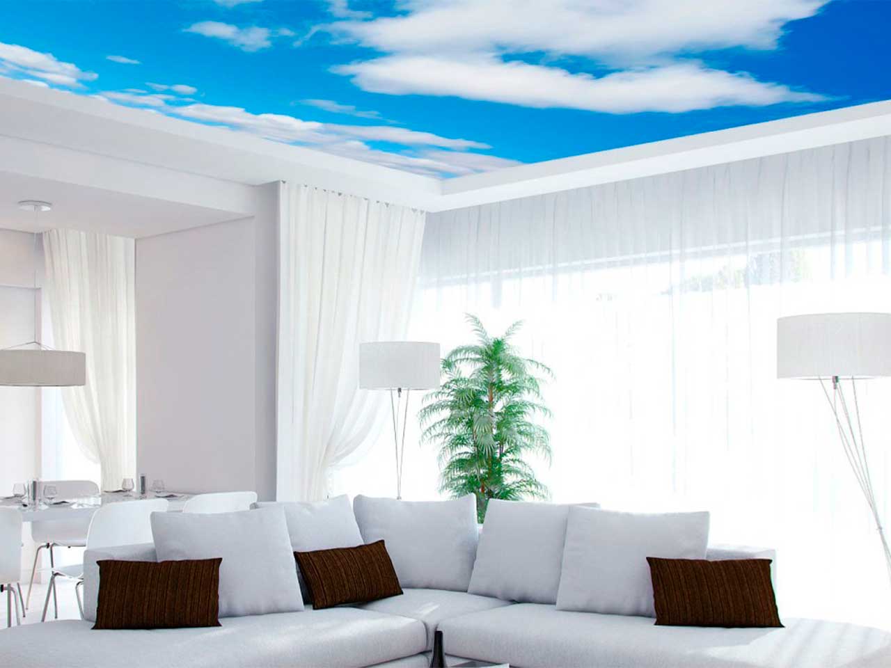 Голубой глянцевый потолок создаёт ощущение неба и простора