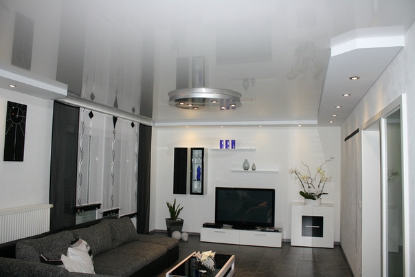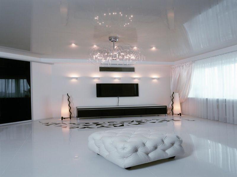 Глянцевый белый потолок украсит даже довольно мрачную комнату.Вы можете усилить этот эффект, используя лампочки. Рекомендуется остановить свой выбор на точечных светильниках. Их следует установить по краям полотна. Светильники на удлиненных ножках можно разместить в центре.