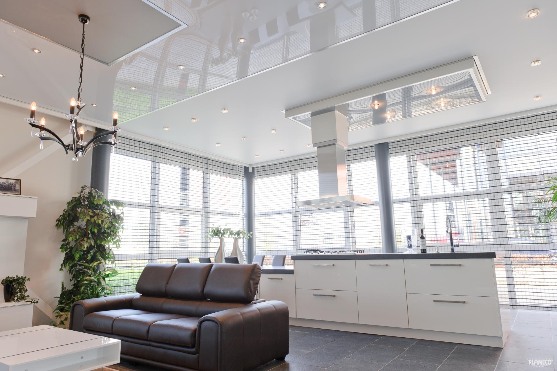 Глянцевые белые потолки хорошо отражают свет. По этой причине такие материалы любимы многими дизайнерами. Такой потолок можно использовать для визуального расширения комнаты. Такие покрытия отражают предметы мебели и другие вещи, находящиеся в комнате, что придает помещению атмосферу бесконечности.