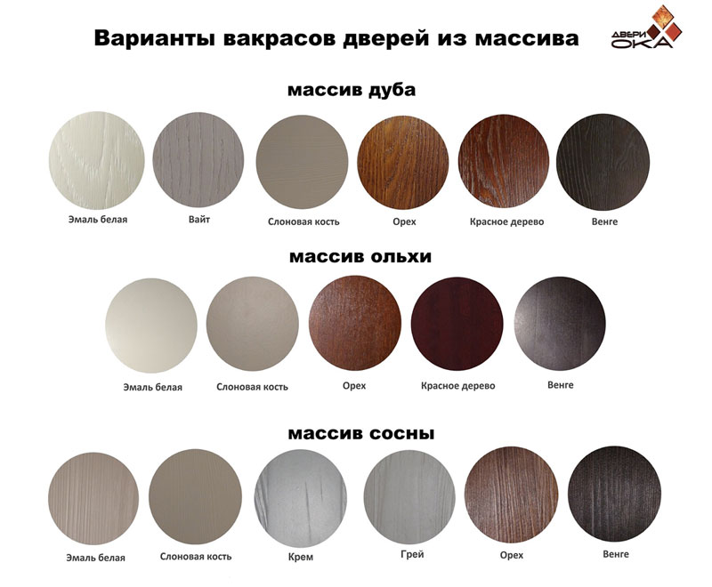 Для дверей из массива дерева, ДСП и пластика выбираются полотна следующих цветов: