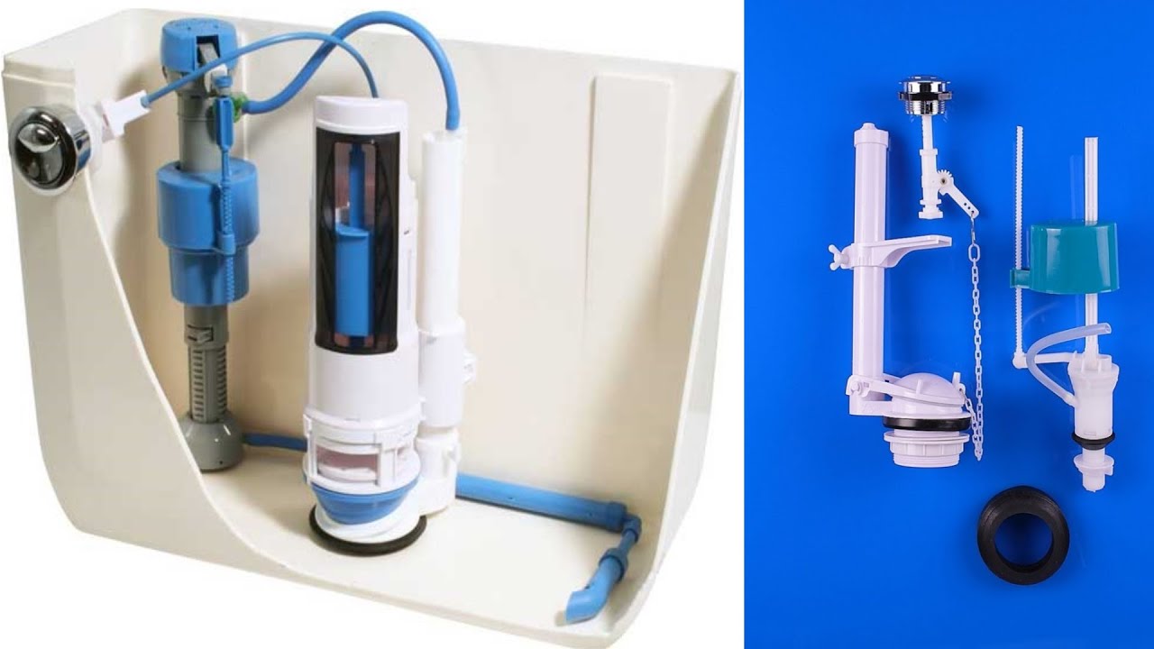 Сливной механизм бачка унитаза разделяется по типу спуска воды.