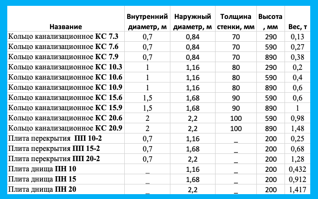 Приведем параметры всех типов выпускаемых колец для наглядности (параметры будут описаны в следующем порядке – высота, толщина стенки, внутренний диаметр и масса):