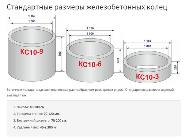 Стандартная высота колец – 90 см, но при необходимости можно дополнить конструкцию кольцами других размеров. В зависимости от нужд выбирается и диаметр — от 70 до 200 см. Толщина бетонной стенки 7-14 см.